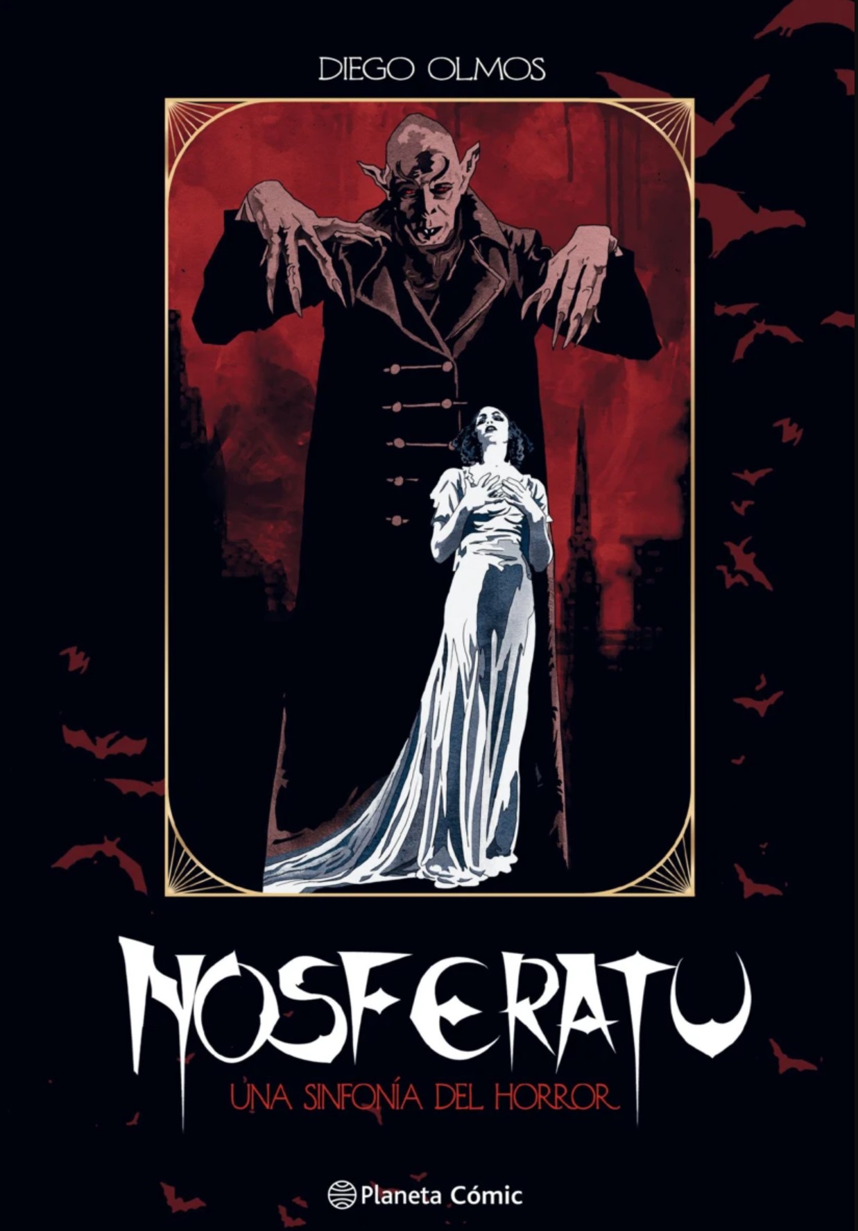 Es increíble lo que un plagio descarado puede llegar a suponer en la historia de la narrativa. Eso es lo que era, a priori, Nosferatu. La película de Friedrich Wilhelm Murnau era una adaptación no autorizada, pero a la vez nada oculta, del Drácula de Bram Stoker, cuando esta novela ni siquiera había llegado por primera vez al cine. Mientras Nosferatu se estrenó en 1922, la primera película de Drácula, la protagonizada por Bela Lugosi, no llegó a los cines hasta 1931. Pero Nosferatu no es una copia, no es solo un Drácula encubierto, no es un proyecto inútil. No, es una película brutal, un ejercicio de expresionismo salvaje, muda, sí, pero cargada de mensajes, de simbolismo y de planos inolvidables, con un protagonista diseñado para aterrorizar. Diego Olmos no conoció Nosferatu por la película original, sino por el remake setentero que protagonizó Klaus Kinski, y aun así la imagen de ese vampiro se le quedó grabada en sus pesadillas. Tanto como para, años después, volver a la cinta original y adaptarla de nuevo en Nosferatu. Una sinfonía del horror, con la misma libertad que el Nosferatu original quiso terror, mostrando un terror primigenio, básico, profundo, que parte de todas y cada una de las apariciones de la criatura, algunas calcadas de la película de 1922, otras de cosecha propia de un autor que se ve que ha disfrutado con este trabajo.