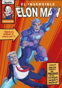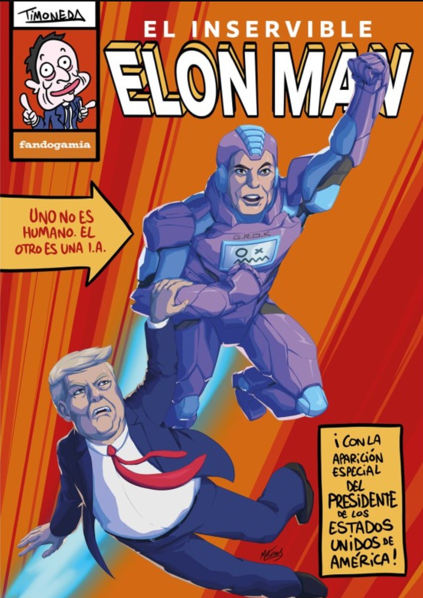 Si en la primera página, una que glosa las advertencias previas para entender El inservible Elon Man, ya se llama imbécil a Elon Musk e idiota a Donald Trump, podemos tener claro desde el principio que Timoneda no pretende hablar bien del personaje al que convierte en un superhéroe de pacotilla, cumpliendo con los más húmedos deseos del hombre que todos asociábamos a Tesla y que decidió unir sus destinos al actual inquilino de la Casa Blanca. Timoneda no se corta lo más mínimo, le presenta, lo dice, como el imbécil definitivo, como un tipo de un ego gigantesco, pero de una inteligencia bastante limitada. Un tipo corto, que se suele decir, de reacciones pueriles y de escasas entendederas. Y con él construye un tebeo breve, quizá mucho más de lo que merecería, que sirve para que, al menos, nos podamos reír de la triste realidad que nos ha tocado vivir, donde personajes de una mediocridad humana gigantesca disfrutan de cuentas corrientes con más ceros de los que la mayoría veríamos en unas cuantas vidas. Sobra decir que El inservible Elon Man es un tebeo militante y más político de lo que su humor directo y radical deja ver en un primer vistazo y, por eso mismo, la ausencia de límites es bastante razonable para construir los gags que van formando el universo de este insufrible personaje protagonista.