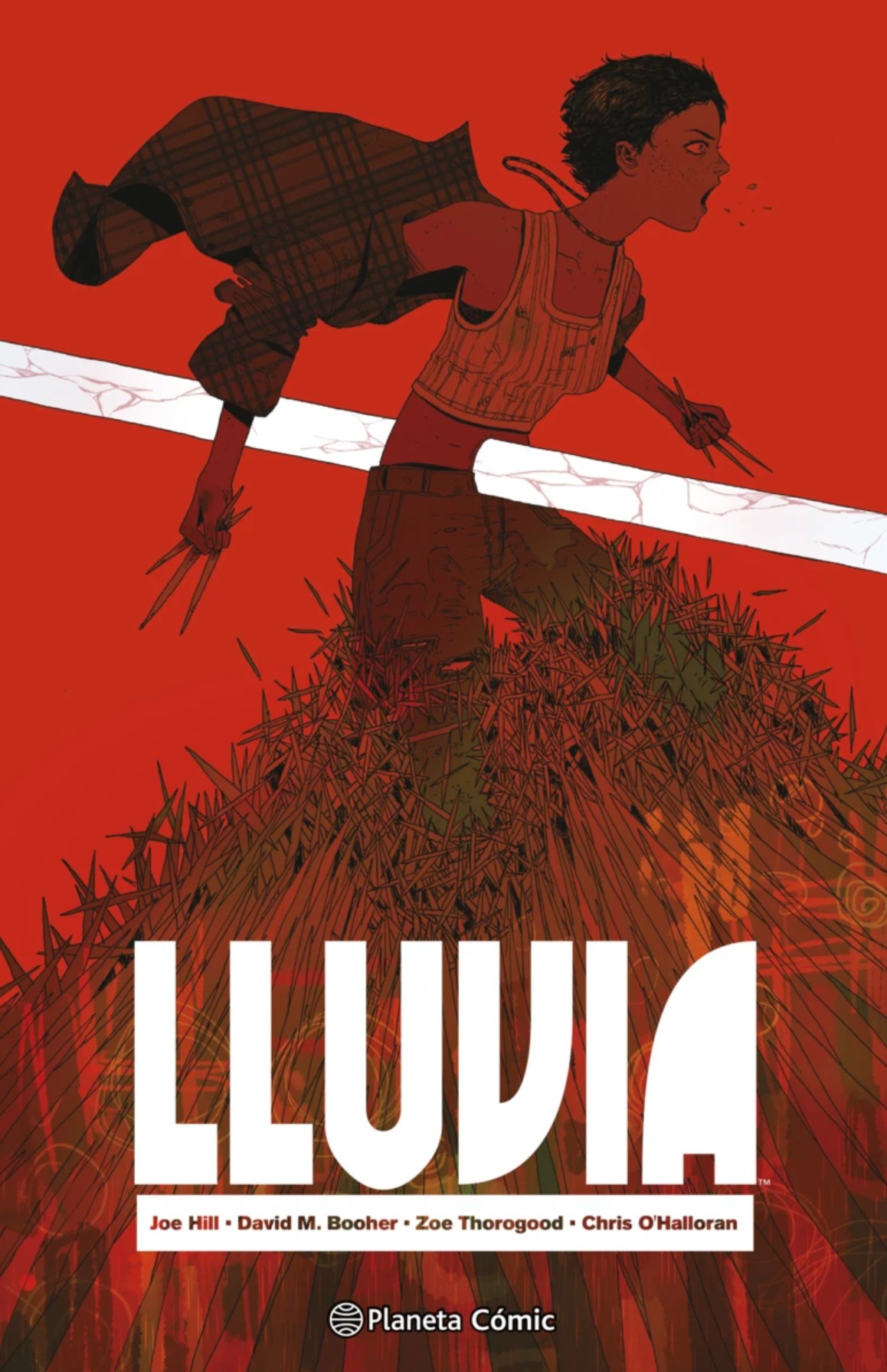 Si no da la sensación de que lo emocional llegue al nivel que se espera es porque el dibujo de Thorogood no termina de explotar. Es una autora de lo más interesante, y aquí su apuesta es de una absoluta frialdad, probablemente buscada, aunque no consigue del todo el efecto deseado. Incluso en la propia lluvia no hay una narrativa del todo clara. Parece claro que la intención es generar desconcierto, que nos sintamos dentro de la piel de los protagonistas, que no entendamos del todo qué es lo que está pasando cuando caen los primeros objetos del cielo, pero es un efecto extraño. Podríamos incluso decir que buena parte del impacto que producen esas secuencias, sobre todo la primera, derivan más de lo que nuestra propia mente extrae de sus espectaculares portadas, estas sí sugerentes al máximo. Lluvia tiene elementos de mucho interés, tanto en su historia como en su dibujo, pero es verdad que se aleja de arquetipos y expectativas en todos los sentidos, dejando en manos de las expectativas de los lectores, más aquí que en otros casos, el veredicto final de lo que estamos viendo. Lo que sí está claro es que Hill es un nombre notable del terror actual, que el cómic está encontrando buenas maneras de adaptarle y que en Lluvia el retrato social que hace es sugerente y casi más aterrador por momentos que el hecho de que caigan cuchillas del cielo.