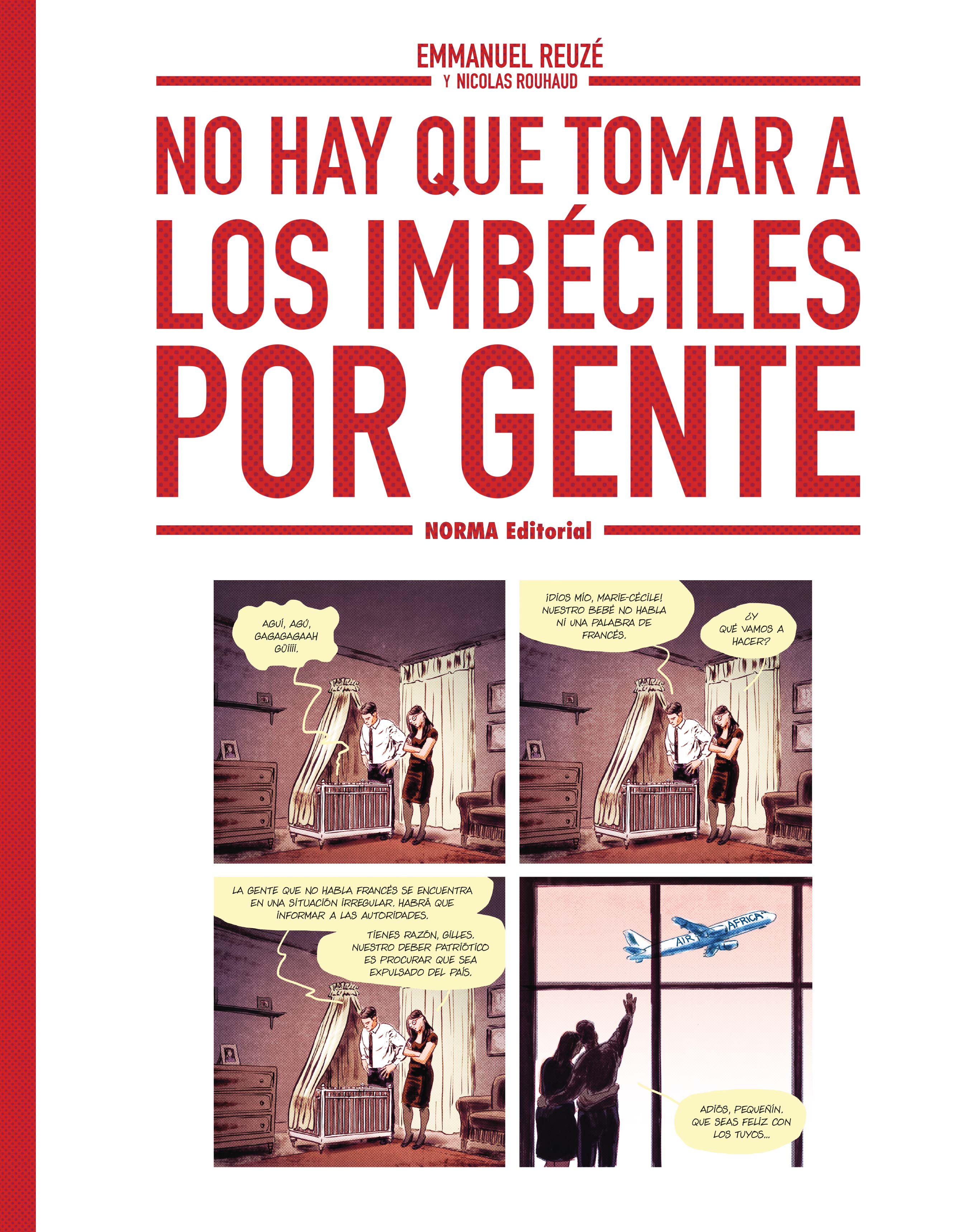 Si lo que querían Emmanuel Reuzé y Nicolas Rouhaud era llamar la atención del lector y, sobre todo, del posible comprador, no podían haber escogido mejor título para su obra. No hay que tomar a los imbéciles por gente es una definición perfecta de lo que esconde un trabajo que toca situaciones tan absurdas que podrían ser reales. Habla de la idiotez de la sociedad actual en temas que tendrían que ser serios, y habla precisamente con una seriedad que se contrapone con los cómicos objetivos que persigue, haciendo que la ironía sea el elemento más evidente de este trabajo tan singular. Y si es singular es porque, en el fondo, no estamos ya tan acostumbrados a que la comedia se entienda de esta manera en la que, como lectores, nos sentimos respetados. Reuzá y Rouhaud respetan al lector, y por eso mismo no parecen tener miedo a que este se pueda identificar en cualquiera de las ridiculizaciones que lanza en cada página. Contundente y mordaz, es un tebeo que parece más bien una antología de gags, pero que tiene un conjunto bastante evidente y que se resume de la mejor manera con ese título. Y es que, sí, todos podemos tener la sensación de vez en cuando de que estamos rodeados de imbéciles, que es lo que realmente nos cuentan los autores con un descaro bastante notable.